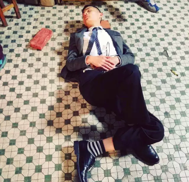 ▲ 土豪阿虎拍大夜戏,累到在地上睡着了 (李卓恒 饰)