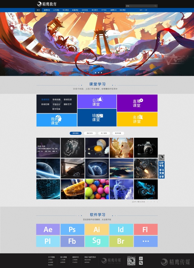 该平台包括精鹰课堂、培训课堂、名师讲堂、公开课堂、直播课堂、图书教材、VIP专区等七大内容版块,涵盖三维特效、电视包装、影视特效、影视拍摄、影视后期、动漫绘制等10多个科目,上百门课程。